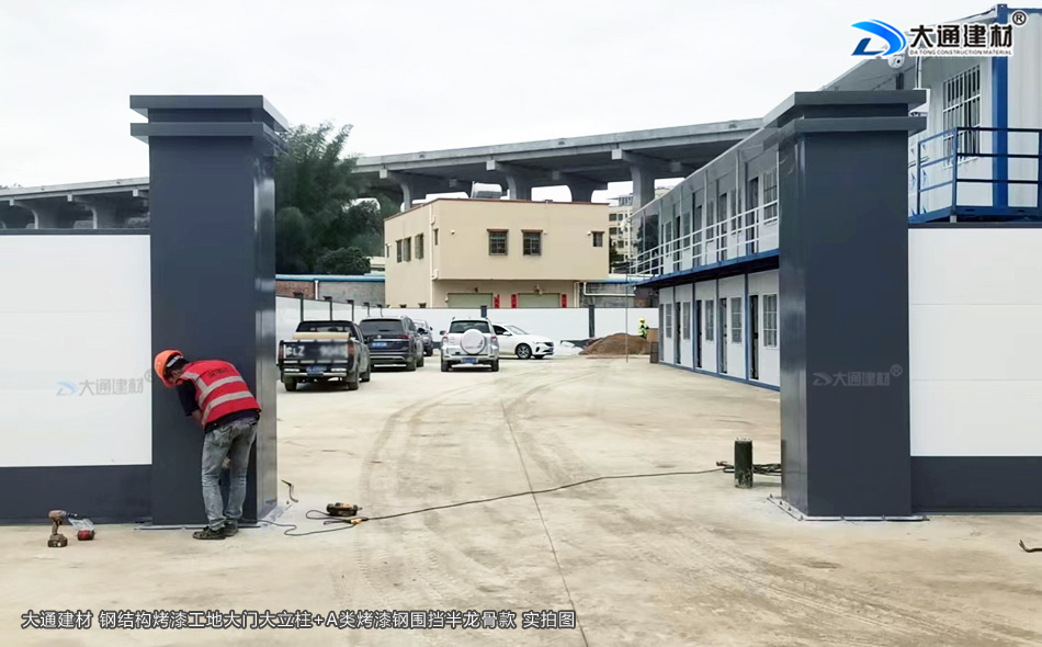 深圳市大通建材的鋼結構烤漆工地大門立柱安裝中