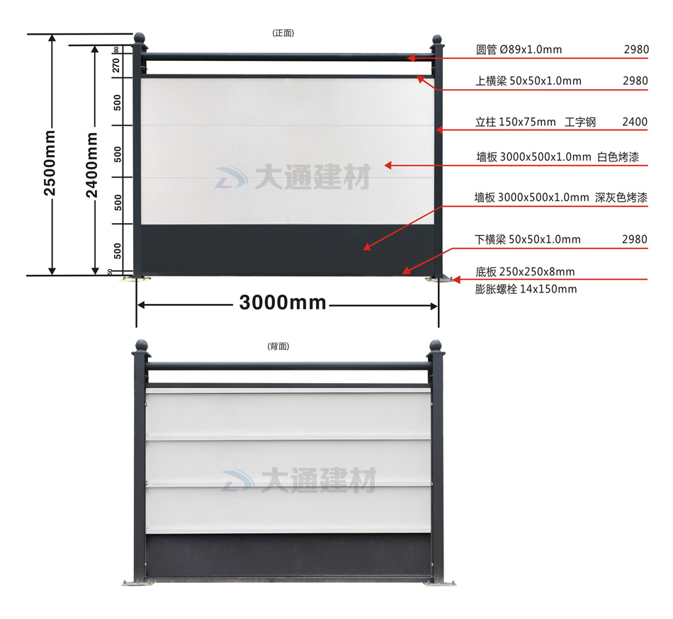 施工安全方案解決工程師,24小時在線等候您的咨詢!深圳市大通建材有限公司10多年來一直從事圍擋生產批發工作,在東莞設有大型鋼結構圍擋生產基地,那么大通建材C類裝配式鋼結構圍擋烤漆款有怎樣的規格特點呢?現在就與大通鋼結構圍擋小編一起了解一下吧。