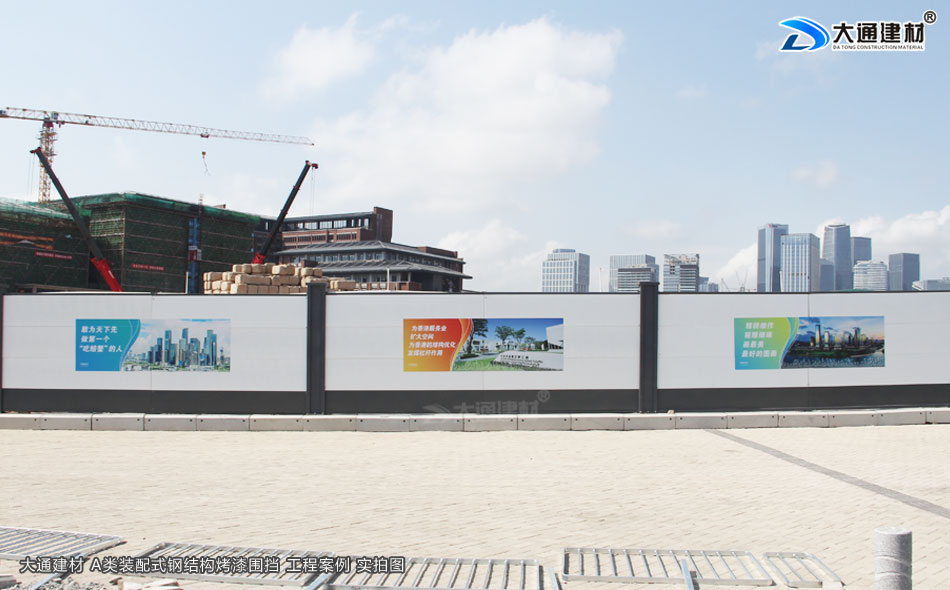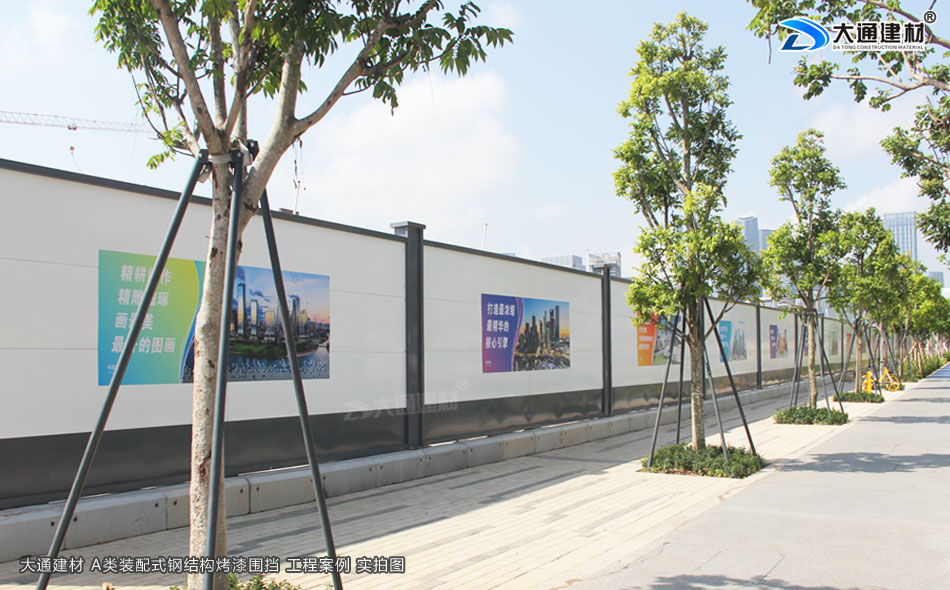 大通建材A類裝配式鋼圍擋,堅(jiān)持深圳質(zhì)量,關(guān)注城市美學(xué),培育精益求精的工匠精神,結(jié)合深圳開放、創(chuàng)新、現(xiàn)代、濱海的城市的特征和公益宣傳的要求。提供具備不同區(qū)域環(huán)境特點(diǎn)的外觀設(shè)計(jì)方案,外觀顏色可以是白色+深灰色烤漆擋板(亦可是全白色烤漆擋板),美觀大氣的現(xiàn)代風(fēng)格;再結(jié)合城市區(qū)域特點(diǎn),分片區(qū)、分道路、分街景各自選用同類風(fēng)格圍擋,營造美觀、整潔的城市環(huán)境的同時(shí),實(shí)現(xiàn)圍擋風(fēng)格區(qū)域性的協(xié)調(diào)統(tǒng)一。