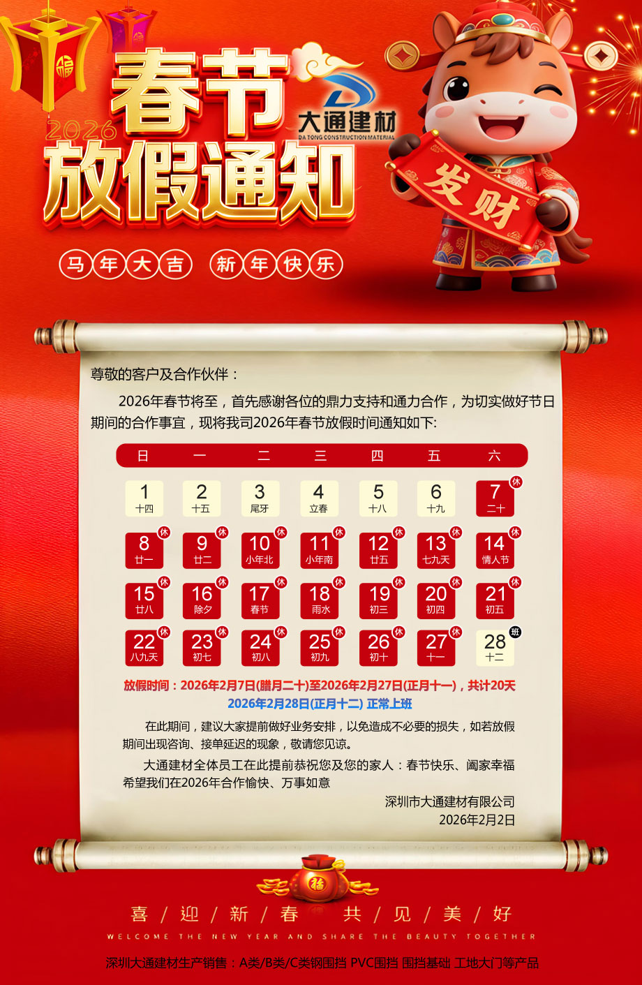 大通圍擋為您解答關于“深圳市大通建材有限公司“2026年春節”放假通知”相關問題?
