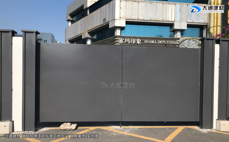 大通建材鋼結構烤漆款標準工地大門,不僅工地大門的門板與立柱的顏色可定制,工地大門的尺寸規格(長度、高度)等也可定制化生產。深圳大通建材是生產鋼結構烤漆款標準工地大門源頭廠家,在東莞設有大型的標準工地大門生產基地,大通標準工地大門貨源充足,常規款標準工地大門有現貨,下單可安排裝車配送安裝。