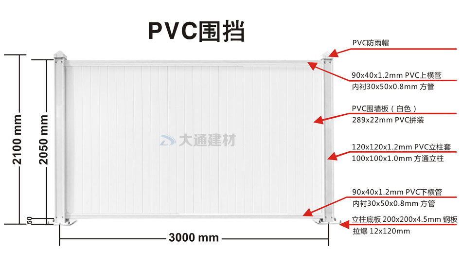 上圖展示的是大通白色PVC圍擋 規(guī)格參數(shù)圖