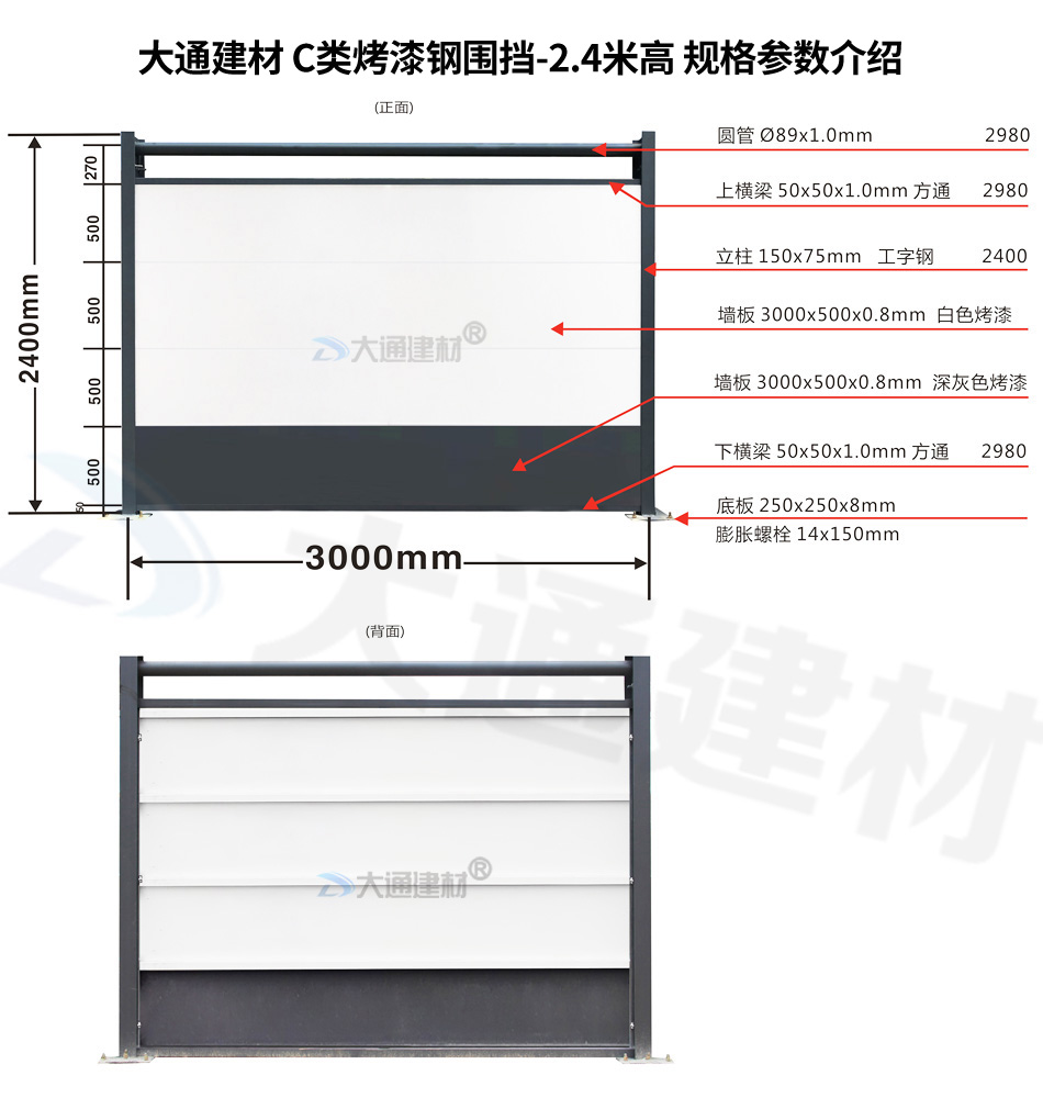 大通建材C類裝配式鋼結(jié)構(gòu)圍擋-烤漆款的烤漆鋼板厚度是0.8mm,采用150*75mm工字鋼立柱,同時(shí)每一擋圍擋的長度都是3米,高度是2.4m,其它具體參數(shù)規(guī)格請參照上述展示的圍擋參數(shù)圖。