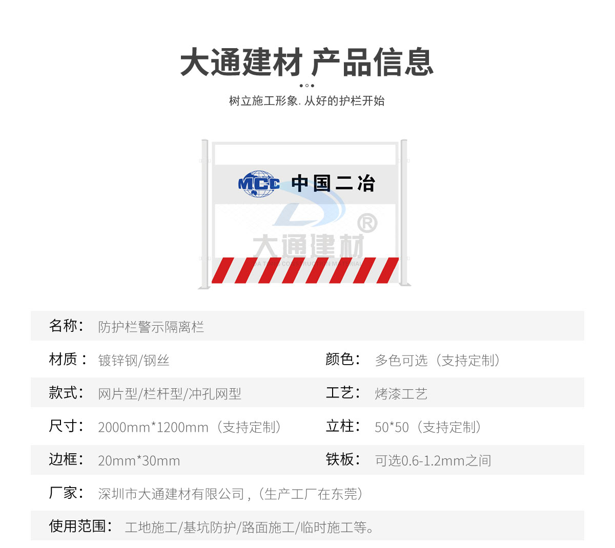 深圳市大通建材有限公司是一家集研發、生產、安裝、服務于一體的綜合性圍擋廠家,公司主營產品鋼圍擋、鋼結構圍擋、PVC圍擋、施工圍擋、市政圍擋、工地圍擋、烤漆鋼圍擋,官網:http://m.noblekids.com.cn/ ,銷售熱線:138 2656 2448