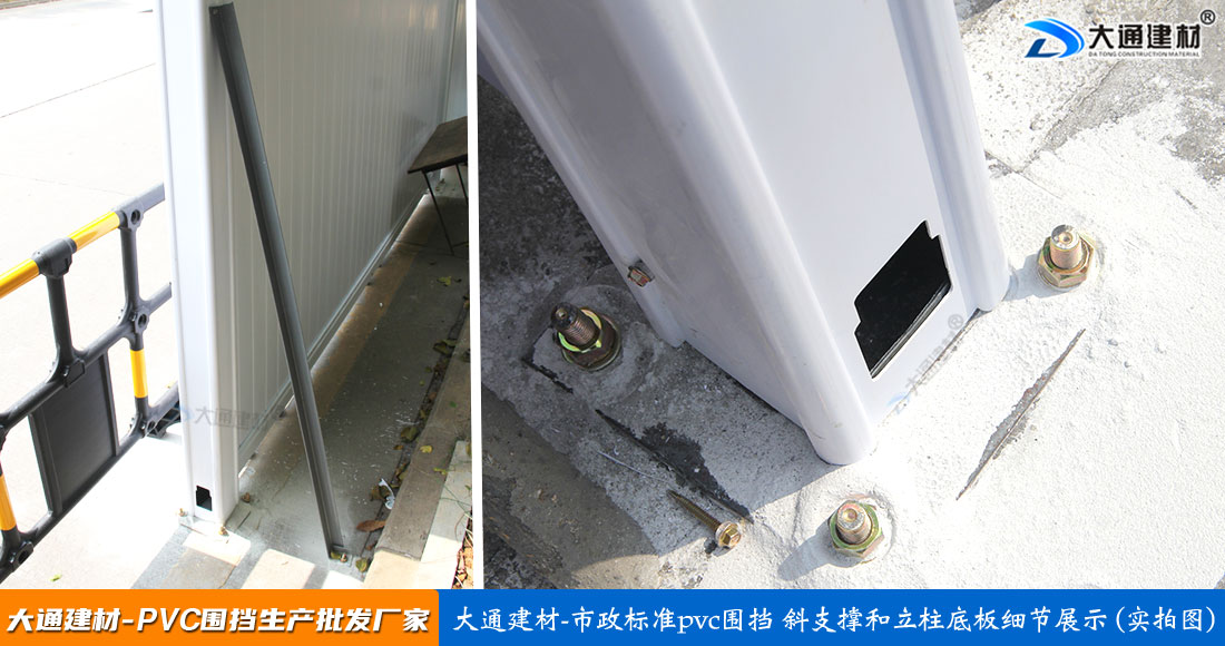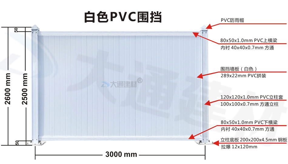深圳市大通建材生產(chǎn)批發(fā)PVC圍擋符合市政標(biāo)準(zhǔn),這款圍擋的圍墻板面采用PVC長(zhǎng)條版拼接,立柱、橫管均為PVC材料,內(nèi)部均襯方通。立柱底板為鋼板,并加斜撐受力。大通建材常規(guī)款PVC圍擋尺寸長(zhǎng)3mx高2.5m、長(zhǎng)3mx高2.2m、長(zhǎng)3mx高2.0m 其它PVC圍擋尺寸可按實(shí)際需要進(jìn)行定制生產(chǎn)。